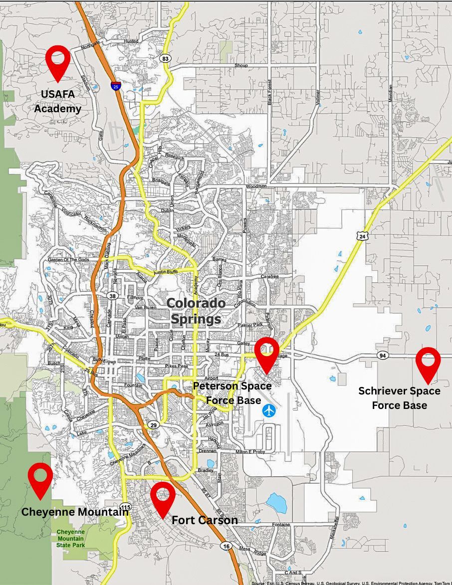Schriever Space Force Base - About 10 miles further east of Peterson. More of a commute, but some families prefer the quieter communities nearby.